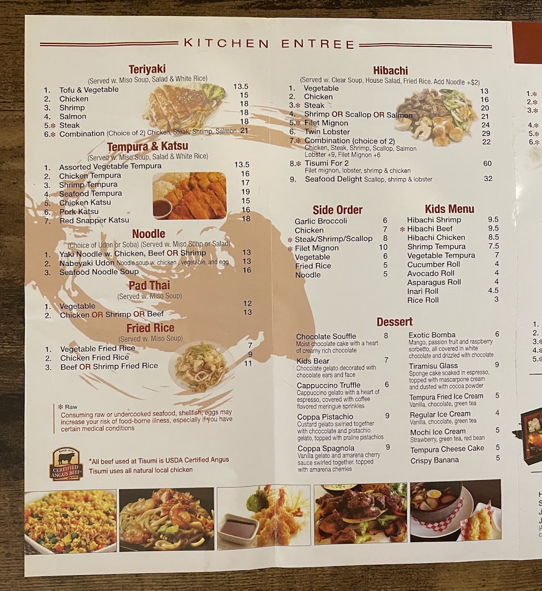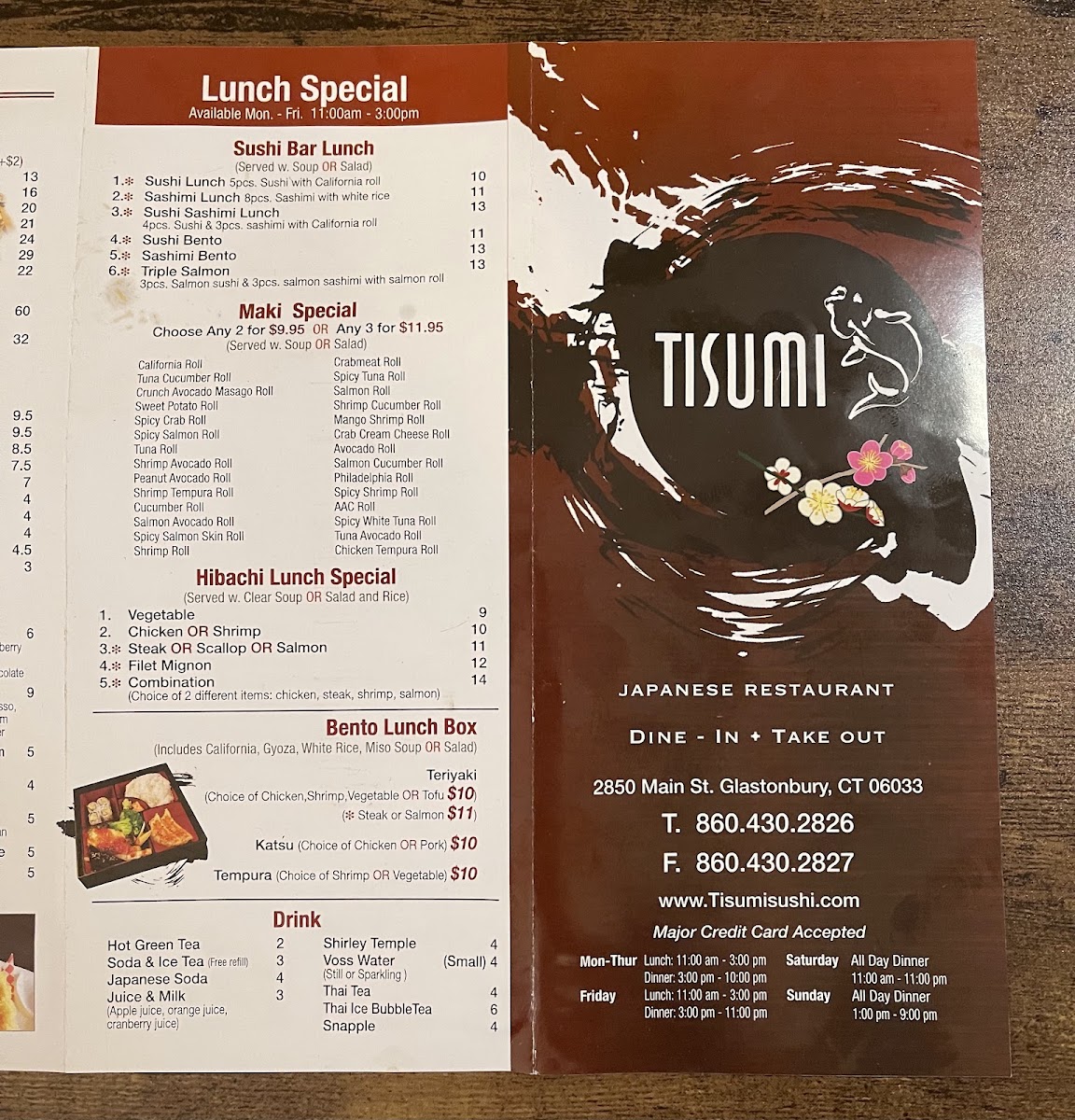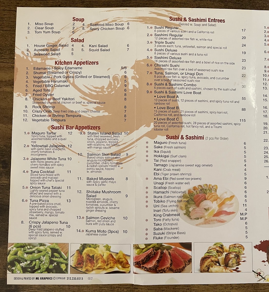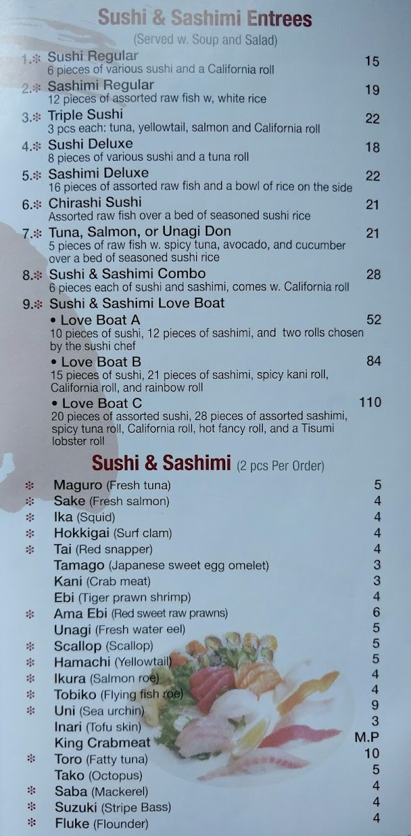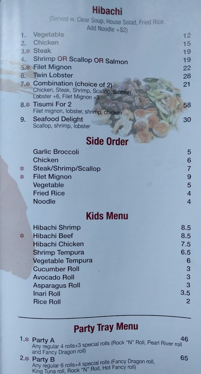 20 pieces of sushi, 28 pieces of sashimi, spicy tuna roll, California roll, hot fancy roll and Tisumi lobster roll.